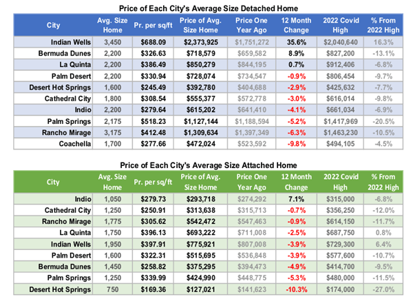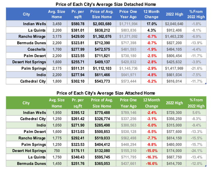 These two tables display the price and price per square foot of the average size home in each city. The median price per sq. ft. in the third column is calculated over the last three months. This is multiplied by the average size home to produce a price, which is compared to the price a year ago. Changes in the average size detached home in each city range from a change of 17.0% in Indian Wells to -5.2% in Cathedral City. In attached homes changes range from -2.4% in Indian Wells to -16.6% in Bermuda Dunes.