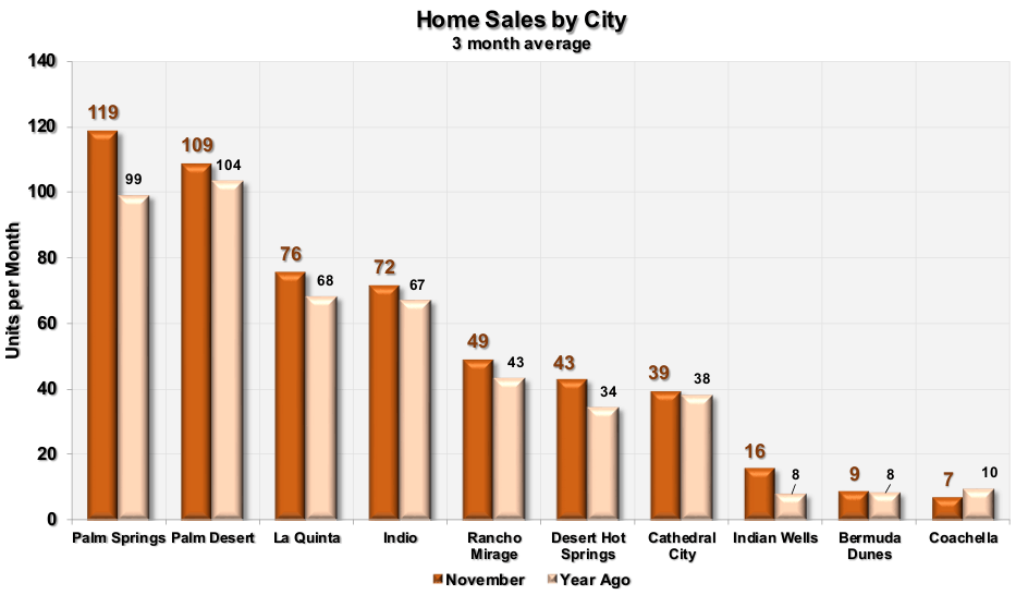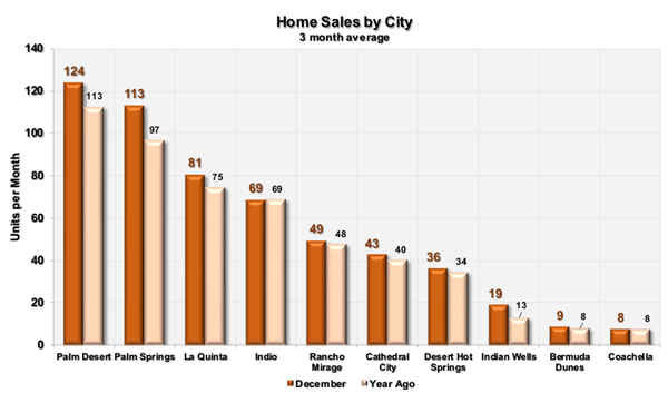 Sales by city are ranked left to right by highest average sales. Palm Springs has the highest unit sales at 118 followed by Palm Desert with 101, then La Quinta with 77. Bermuda Dunes has the lowest average sales at 8 units a month.