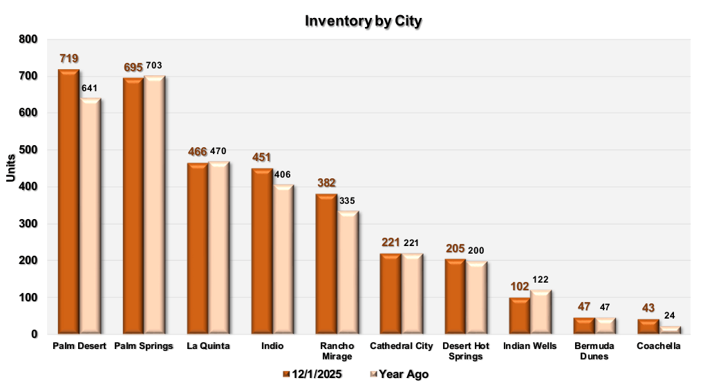 This chart ranks Coachella Valley cities left to right by highest number of homes for sale. The orange bars are current listings, while the lighter colored bars are last year’s number. The city with the largest inventory is Palm Desert with 663 units, followed by Palm Springs with 644. This chart helps agents know what cities have homeowners with the greatest selling interest and how it compares to last year.