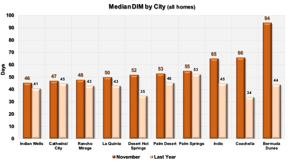 This graph compares the median number of “days in the market” in each city to their ratios a year ago. The number includes both detached and attached homes. We have sorted the cities left to right by lowest number of days. Indian Wells has the lowest average selling time at just 46 days. This is followed by Cathedral City at 47 days. Bermuda Dunes has the highest median selling time at 94 days.