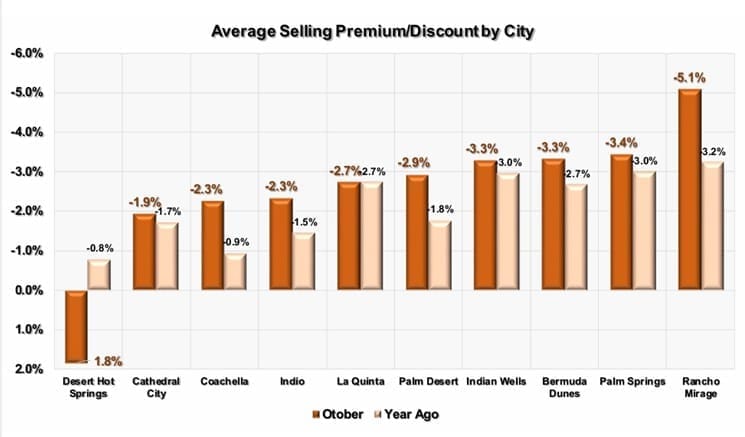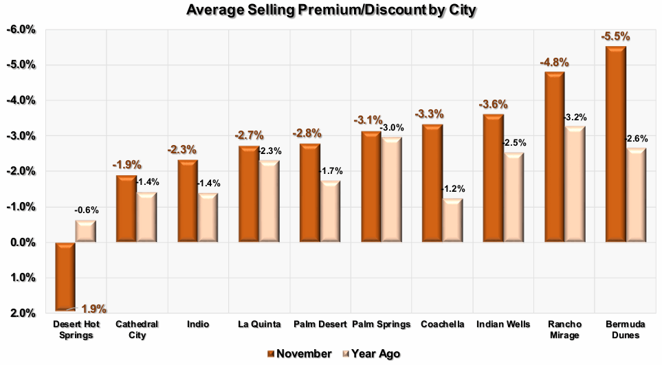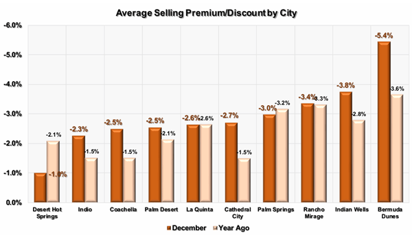 This shows the average price discount for detached homes in each city to their ratios a year ago. We have sorted the cities left to right by lowest discount. In general, cities with higher priced homes sell at larger discounts. The city of Desert Hot Springs has the best premium/discount at -1.0%, while Bermuda Dunes has the most extreme premium/discount of -5.4%.