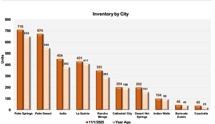 This chart ranks Coachella Valley cities left to right by highest number of homes for sale. The orange bars are current listings, while the lighter colored bars are last year’s number. The city with the largest inventory is Palm Springs with 710 units, followed by Palm Desert with 674. This chart helps agents know what cities have homeowners with the greatest selling interest and how it compares to last year.