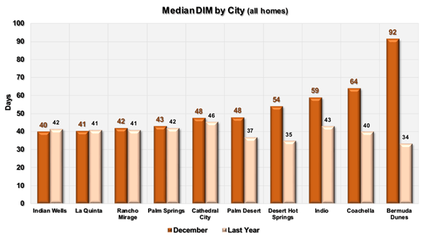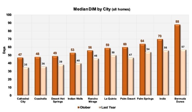 This graph compares the median number of “days in the market” in each city to their ratios a year ago. The number includes both detached and attached homes. We have sorted the cities left to right by lowest number of days. Cathedral City has the lowest average selling time at just 47 days. This is followed by Coachella at 48 days. Bermuda Dunes has the highest median selling time at 88 days.